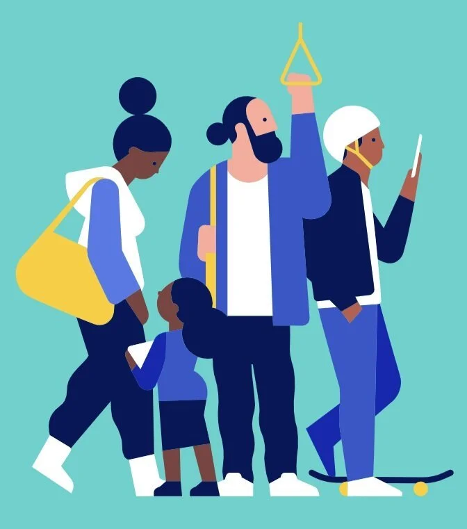 The new PBS logo was more round than the original, so Kathleen helped choose an illustrator that incorporated a lot of round and flat elements to create a world beyond photographs that would work well across PBS’s media. Jerome Masi created a set of 20 brand illustrations that represented all types of people of varying ethnicities and abilities.